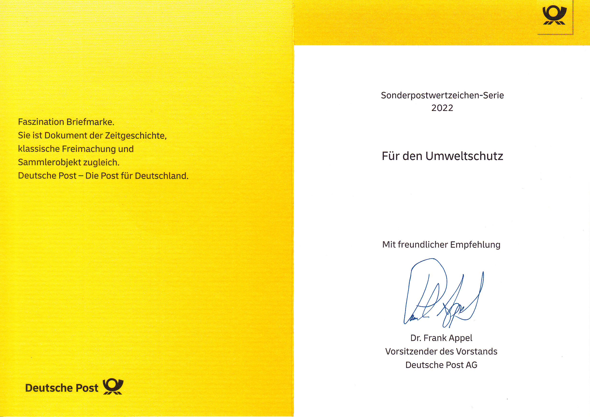 Klappkarte des Vorstandsvorsitzenden der Deutschen Post AG mit der Marke (MiNr 3689) "Umweltschutz" und dem Ersttagsonderstempel Bonn.