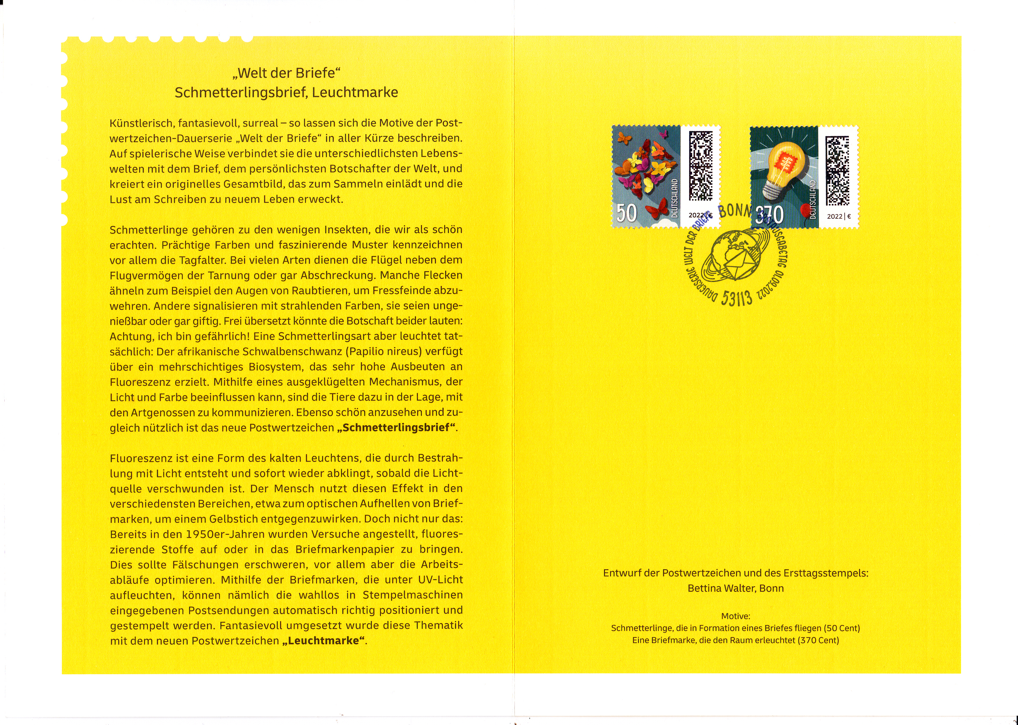 Klappkarte des Vorstandsvorsitzenden der Deutschen Post AG mit je einer Marke für die Jugend 2022 (MiNr 3706 bis 3708) mit Motiven zum Thema "Amphibien". Die Marken sind mit den Ersttagsonderstempel Bonn gestempelt.
