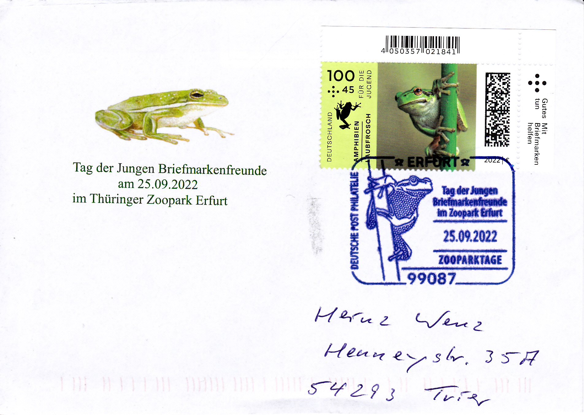 Im Sonderstempel vom 25.9.2022 aus Erfurt zum Tag der Jungen Briefmarkenfreunde im Zoopark Erfurt bei den Zooparktagen bildet ebenfalls einen Europäischen Laubfrosch (Hyla arborea) ab.