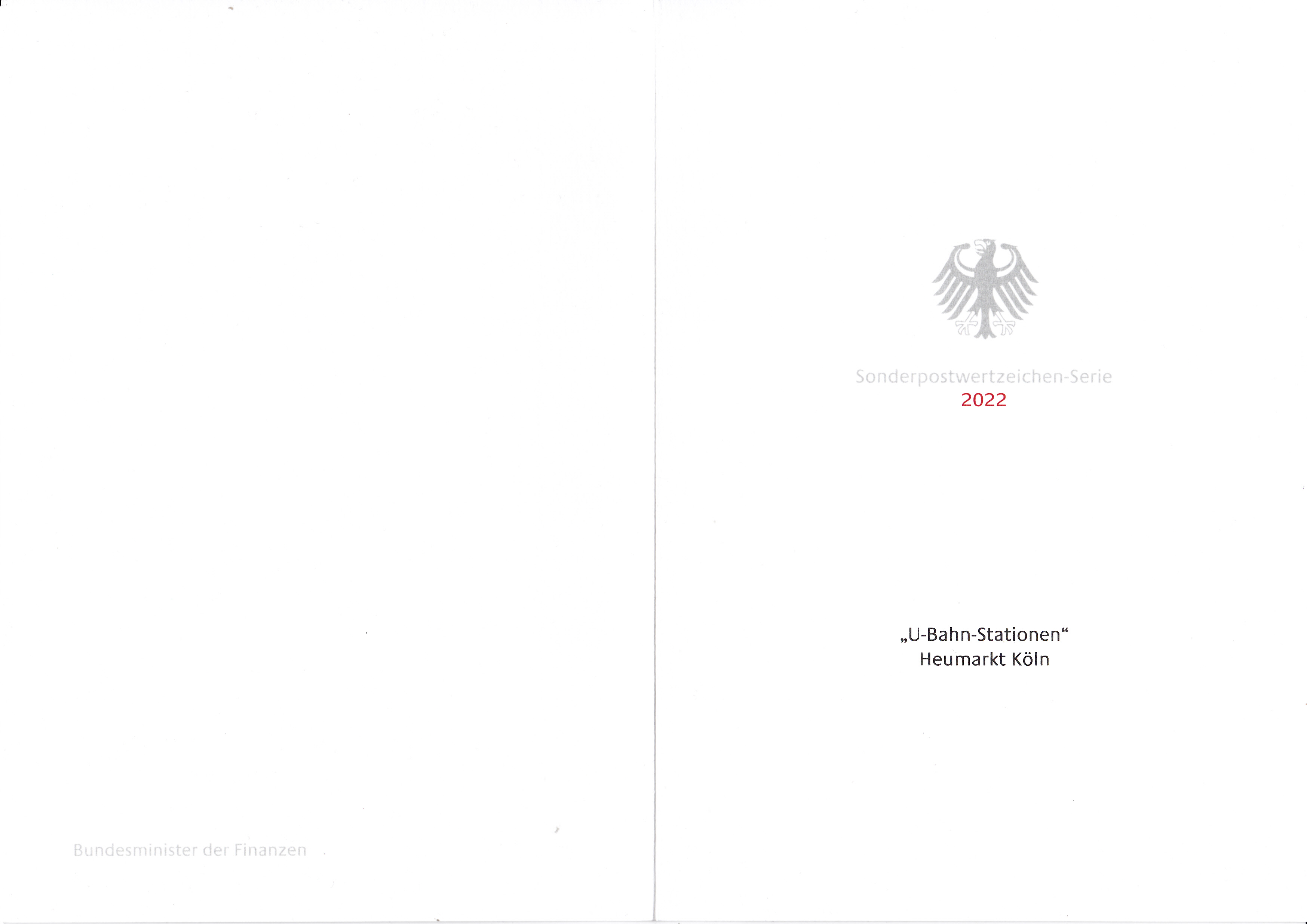 Ministerkarte des Bundesministers für Finanzen mit zwei Marken der Serie "U-Bahn-Stationen" (MiNr 3709) mit dem Motiv "U-Bahn-Haltestelle Heumarkt, Köln" und den beiden Ersttagsonderstempel Bonn und Berlin.