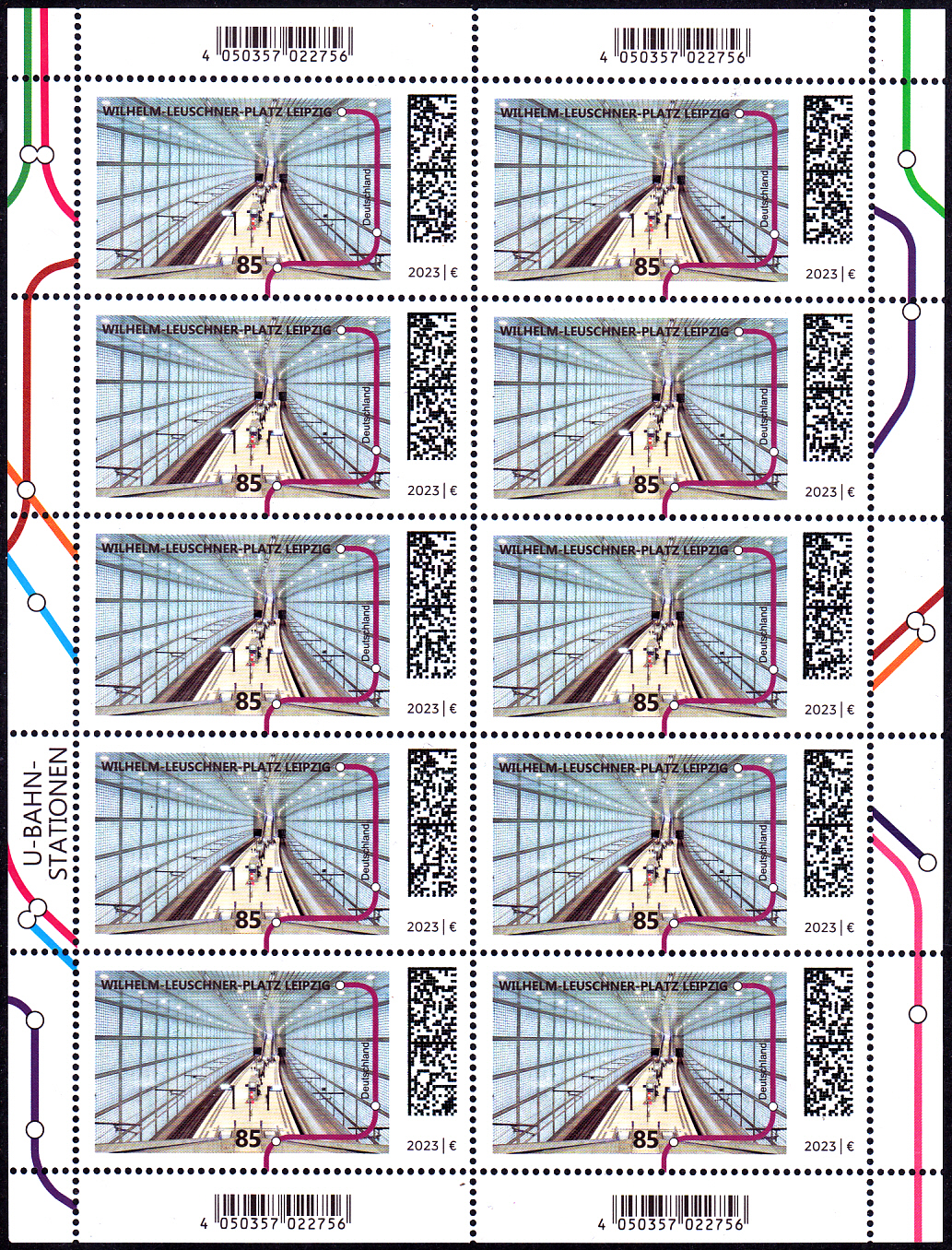 In der Serie "U-Bahn-Stationen" der Deutschen Post ist auch eine Marke (MiNr 3760) mit einer Abbildung zur U-Bahn-Station Wilhelm-Leuschner-Platz Leipzig erschienen. Hier zeige ich ein Eckrandstück mit EAN-Codierung.
