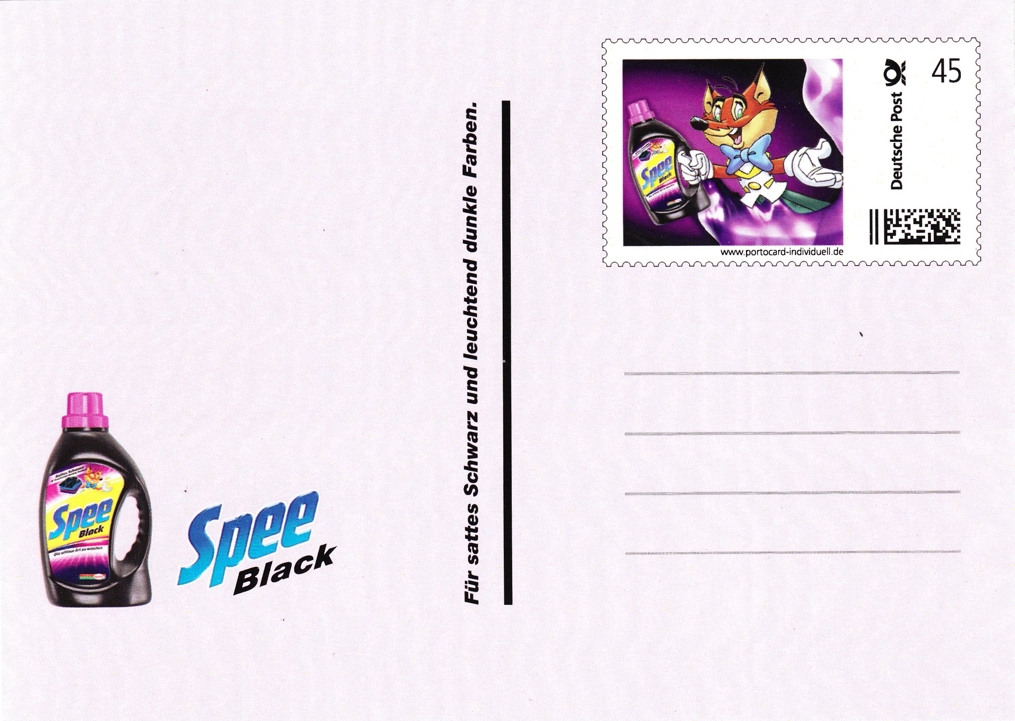 Und eine Ganzsache mit Eindruck einer "www.portocard-individuell.de" mit Werbung zum Produkt "Spee Black":