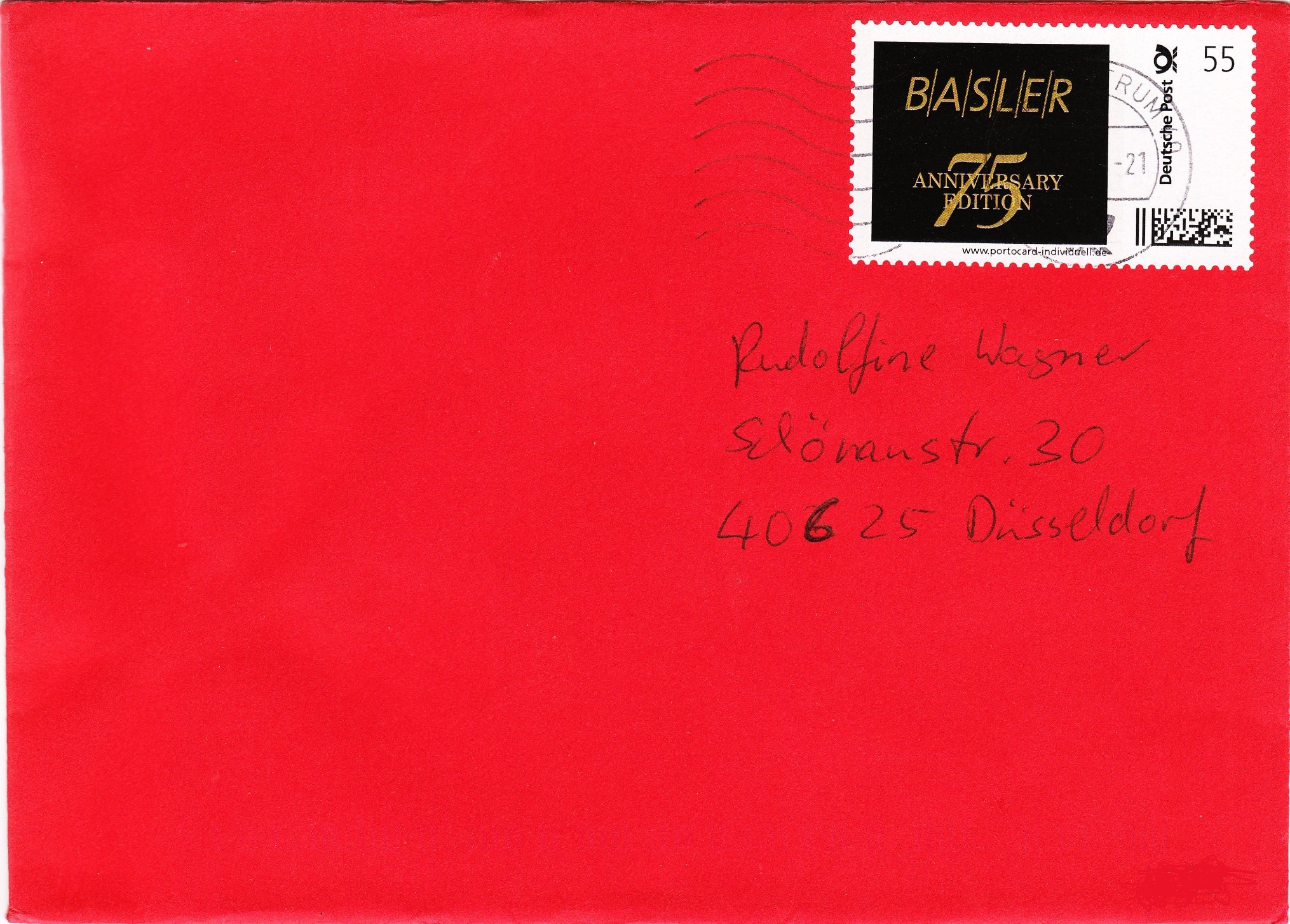 Hier eine Marke aus einer Portocard Individuell, aufgelegt zum 75jährigen Jubiläum der Modefirma BASLER, am 22.12.2011 auf Beleg, gestempelt im Briefzentrum 40: