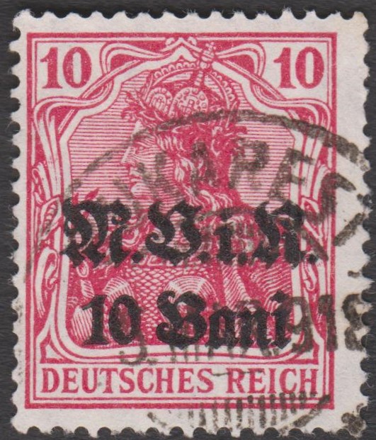 Militärverwaltung in Rumänien MiNr. 4 erschien am 02.07.1917, indem die Wertstufe 10 Pf Germania, Deutsches Reich MiNr. 86 II, mit einem Aufdruck "M.V.i.R." sowie des neuen Wertes "10 Bani" in der Schriftart "Fraktur" in Schwarz versehen wurde: