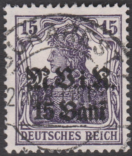 Militärverwaltung in Rumänien MiNr. 5 erschien am 02.07.1917, indem die Wertstufe 15 Pf Germania, Deutsches Reich MiNr. 101, mit einem Aufdruck "M.V.i.R." sowie des neuen Wertes "15 Bani" in der Schriftart "Fraktur" in Schwarz versehen wurde: