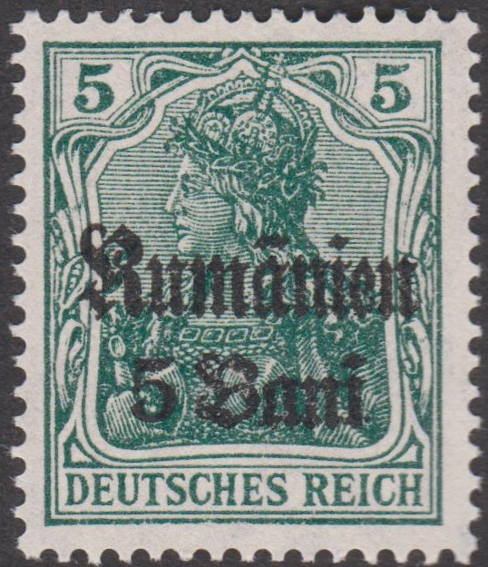Militärverwaltung in Rumänien MiNr. 8 erschien am 01.03.1918, indem die Wertstufe 5 Pf Germania, Deutsches Reich MiNr. 85 II, mit einem Aufdruck "Rumänien" sowie des neuen Wertes "5 Bani" in der Schriftart "Fraktur" in Schwarz versehen wurde: