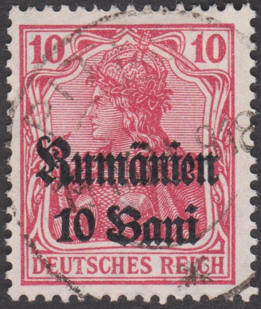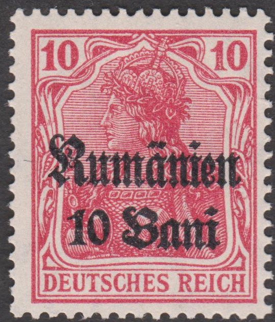 Militärverwaltung in Rumänien MiNr. 10 erschien am 01.03.1918, indem die Wertstufe 15 Pf Germania, Deutsches Reich MiNr. 101, mit einem Aufdruck "Rumänien" sowie des neuen Wertes "15 Bani" in der Schriftart "Fraktur" in Schwarz versehen wurde:
