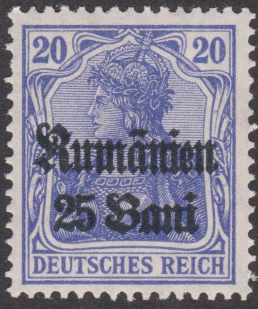 Militärverwaltung in Rumänien MiNr. 11 erschien am 01.03.1918, indem die Wertstufe 20 Pf Germania, Deutsches Reich MiNr. 87 II, mit einem Aufdruck "Rumänien" sowie des neuen Wertes "25 Bani" in der Schriftart "Fraktur" in Schwarz versehen wurde: