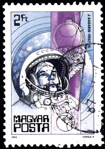 Auf einer Marke (MiNr 3560 A) einer Serie "25 Jahre Weltraumfahrt" aus Ungarn wird Juri Gagarin als erster Mensch im Weltraum gezeigt.