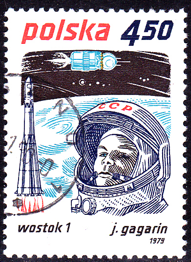 Eine weitere Marke aus Polen (MiNr 2662) zeigt Jury Gagarin und die Trägerrakete von Wostok 1.