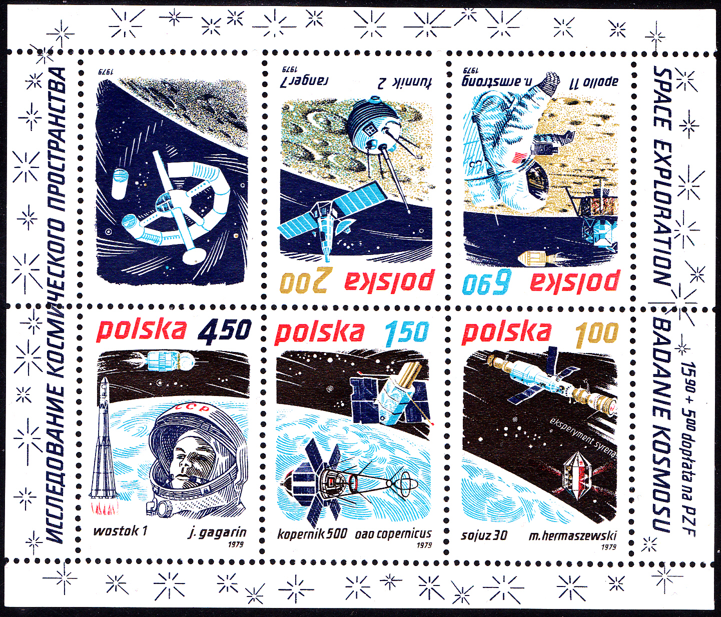 Diese Marke aus Polen ist auch zusammen mit den vier weiteren Marken der Serie und einem Zierfeld in einem Block (MiNr Block 80) erschienen. Hier zeige ich einen kompletten Block.