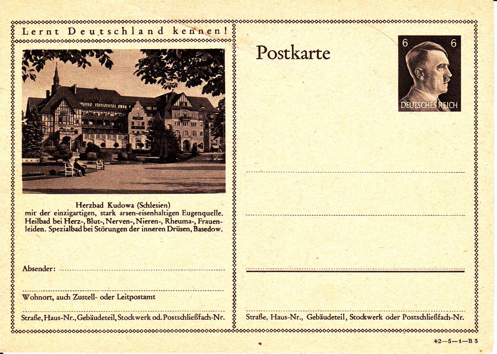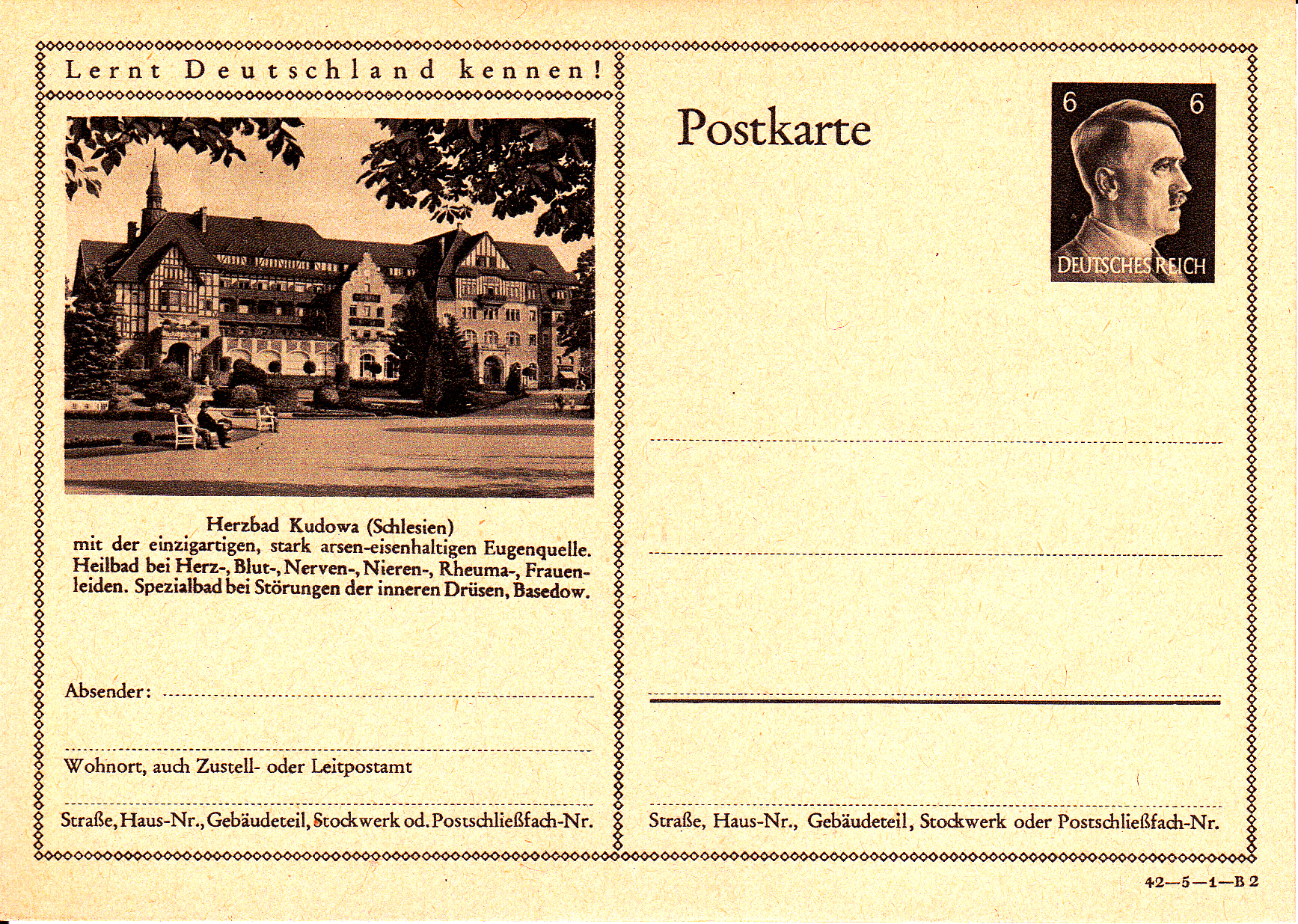 Bad Kudowa (Schlesien) wiederholt erneut auf dieser Bildpostkarte (Serie 5 Bild 1) erneut das Foto mit dem Kurhotel "Fürstenhof" aus den Vorjahren.