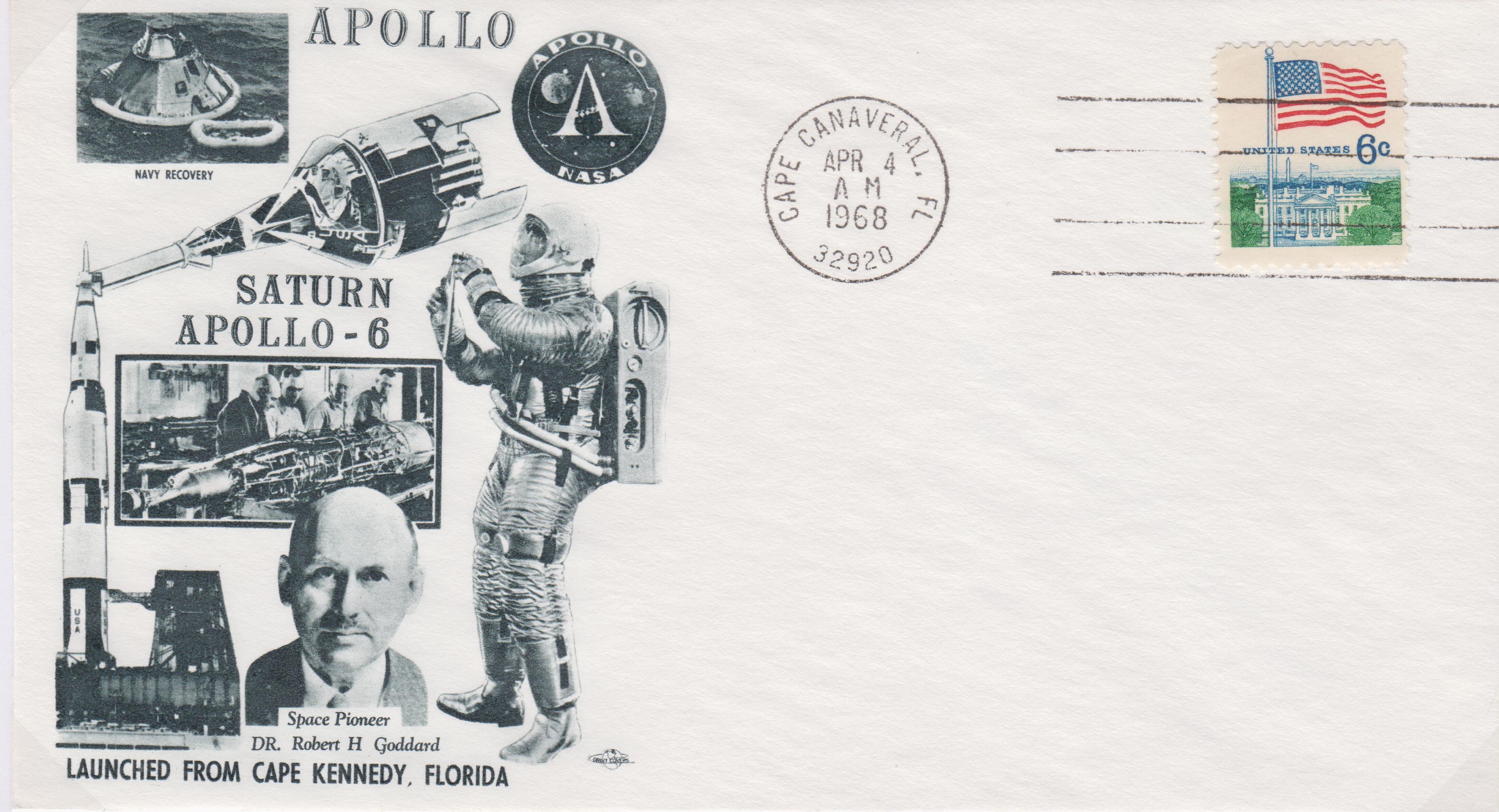 Der Start erfolgte am 04.04.1968 um 12:00 Uhr UTC vom Kennedy Space Center in Florida, was dieser Beleg per blauem Cachetstempel dokumentiert: