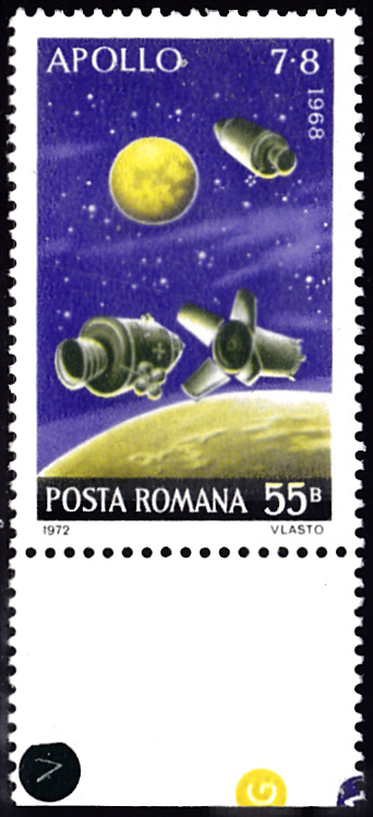 Auf dieser Marke aus Rumänien (MiNr 3072) sehen wir in der Erdumlaufbahn das Eaumschiff und die zweiteb Stufe der Raklete.