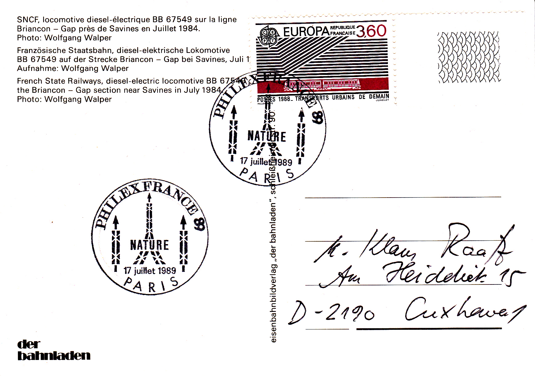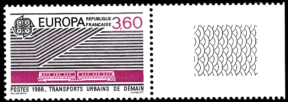 In Frankreich erschienen die Europamarken 1988 zum Gemeinschaftsthema "Transport- und Kommunikationsmittel" am 30. April 1988. Hier die Marke zu 3,60 Fr mit der Abbildung von einem Nahverkehrszug . Die Auflage betrug 5 167 380 Stück.