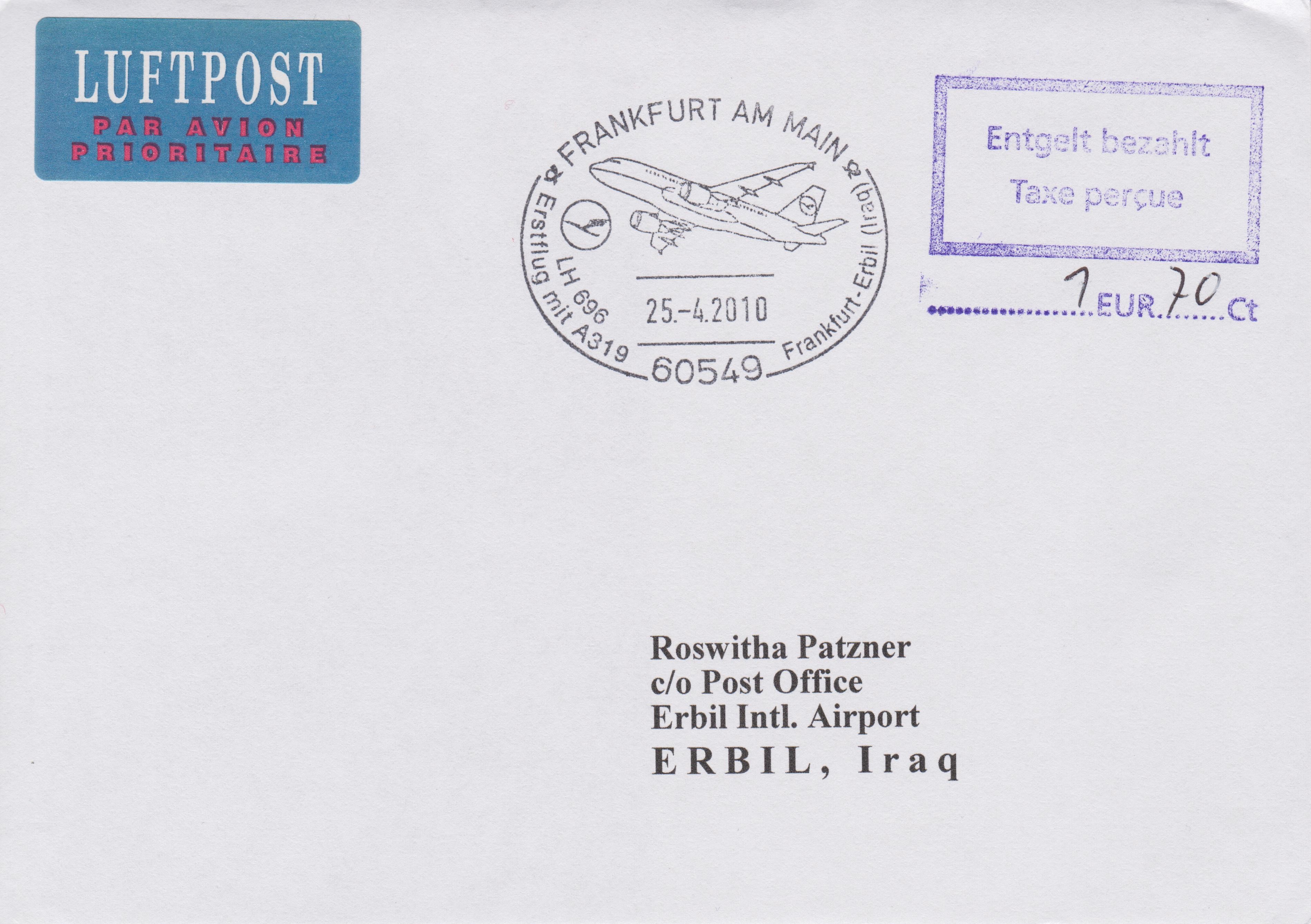 Luftpostbrief, aufgegeben am 08.08.2008 um "02" (= 2 Uhr früh!) in 60549 FRANKFURT-FLUGHAFEN-IPZ 1: