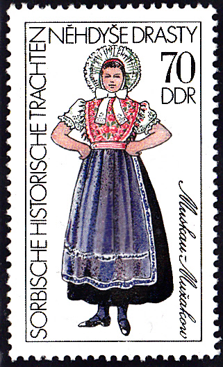 Die fünfte und letzte Marke dieser Serie (MiNr 2217) zeigt uns eine historische Tracht aus Muskau.