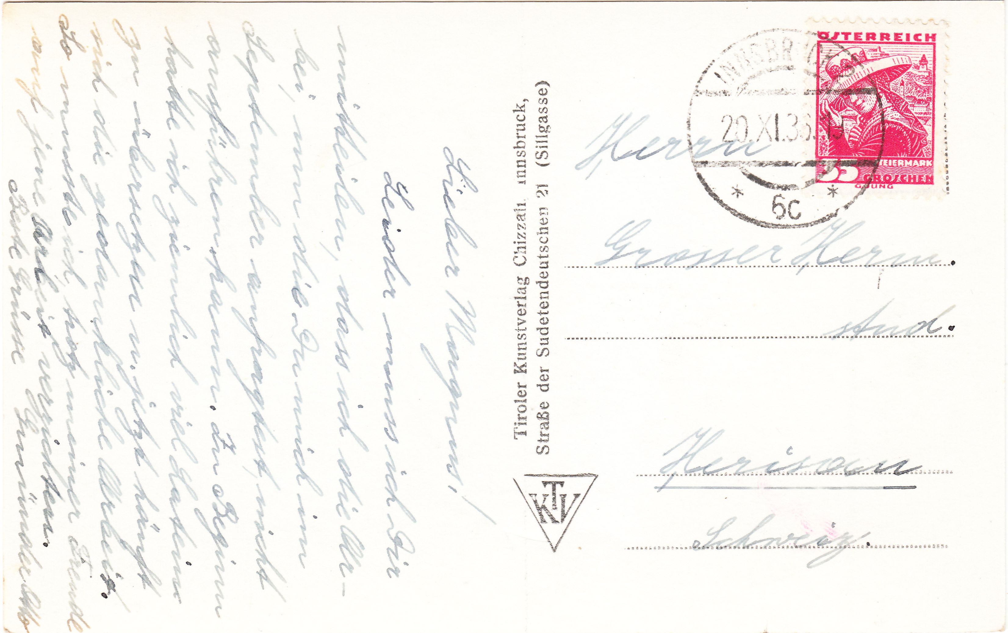 Hier das von Heinz bereits gezeigte Mädchen aus Alt-Aussee (Steiermark) in Tracht mit einem großen Hut auf der Marke Österreich MiNr. 578 als EF auf einer Postkarte in die Schweiz: