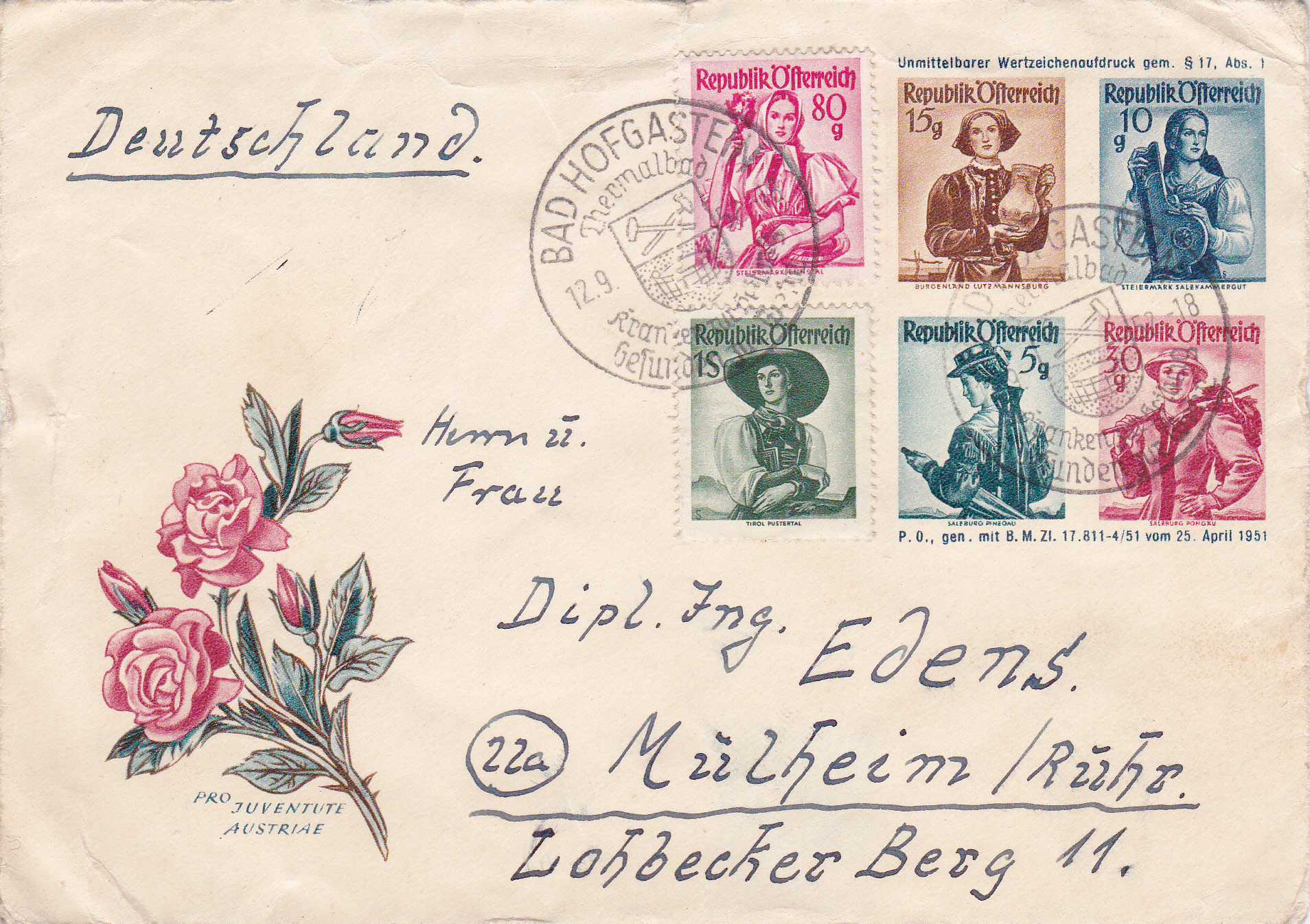 Dieser Ganzsachenumschlag mit vier Wertstempel zeigt ein paar Trachtenmotive, die hier bereits gezeigt wurden. Die Marken zu 80G und 1S sind zusätzlich zur den vier Wertstempel als Marke aufgeklebt worden.