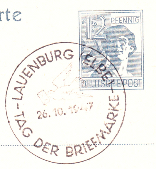 Sonderstempel vom 26.10.1947 aus Lauenburg (Elbe) zum Tag der Briefmarke 1947 mit einer Brieftaube im Stempelbild.