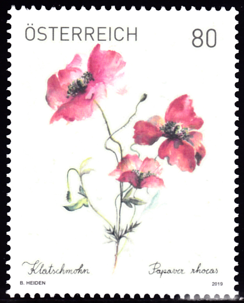 Aus Österreich kommt diese Marke (MiNr 3451) mit Blüten des Klatschmohn (Papaver rhoeas).