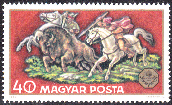Zur Welt-Jagdausstellung in Budapest erschien in Ungarn 1971 in einer Markenserie auch diese Marke (MiNr 2664A) mit einer Darstellung zur Jagd auf Wisente.