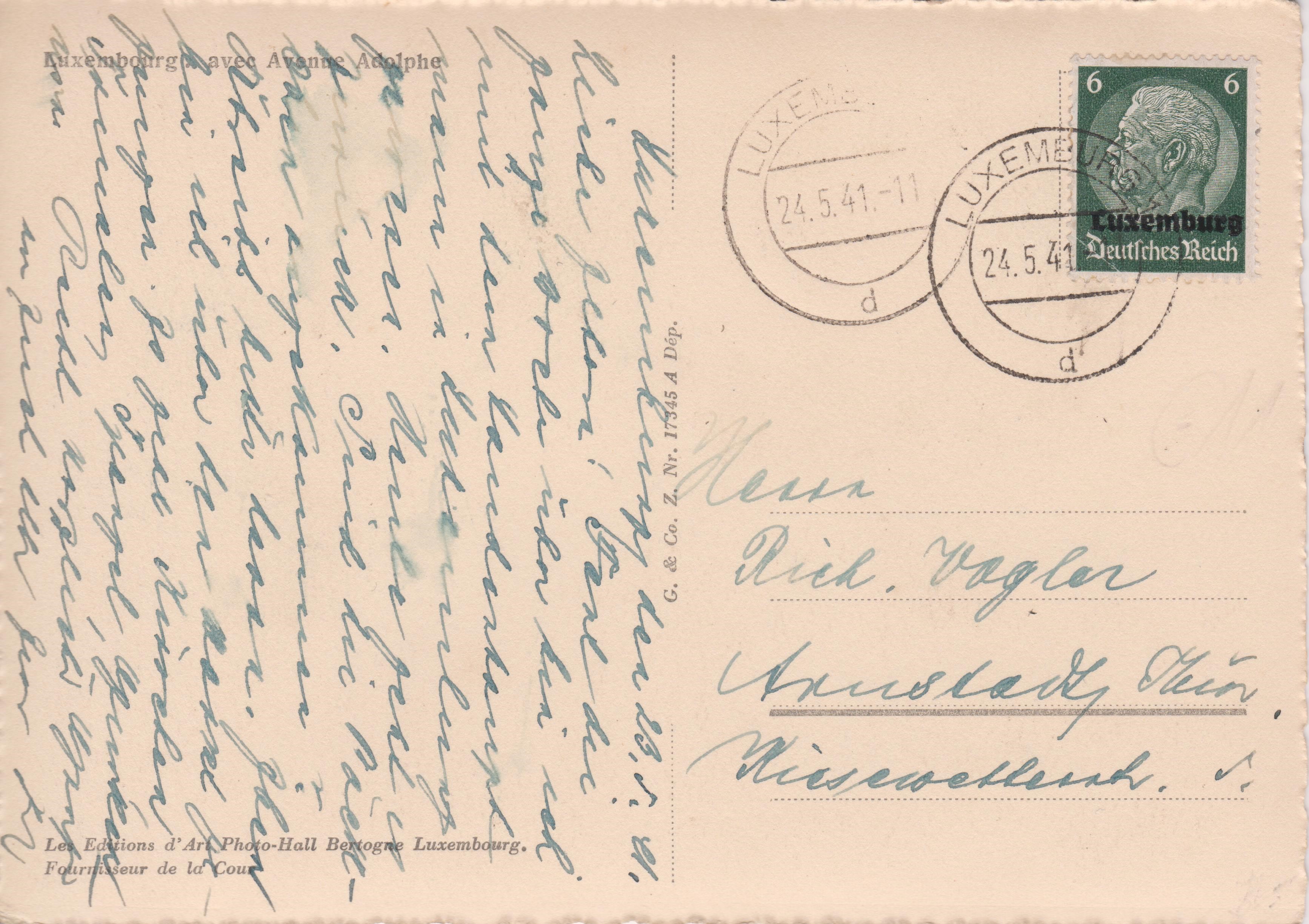 Postkarte mit Einzelfrankatur 6 Pf Dauerserie Hindenburg mit Aufdruck "Luxemburg", aufgegeben am 24.05.1941 in LUXEMBURG, adressiert nach "Armstadt" in Thüringen: