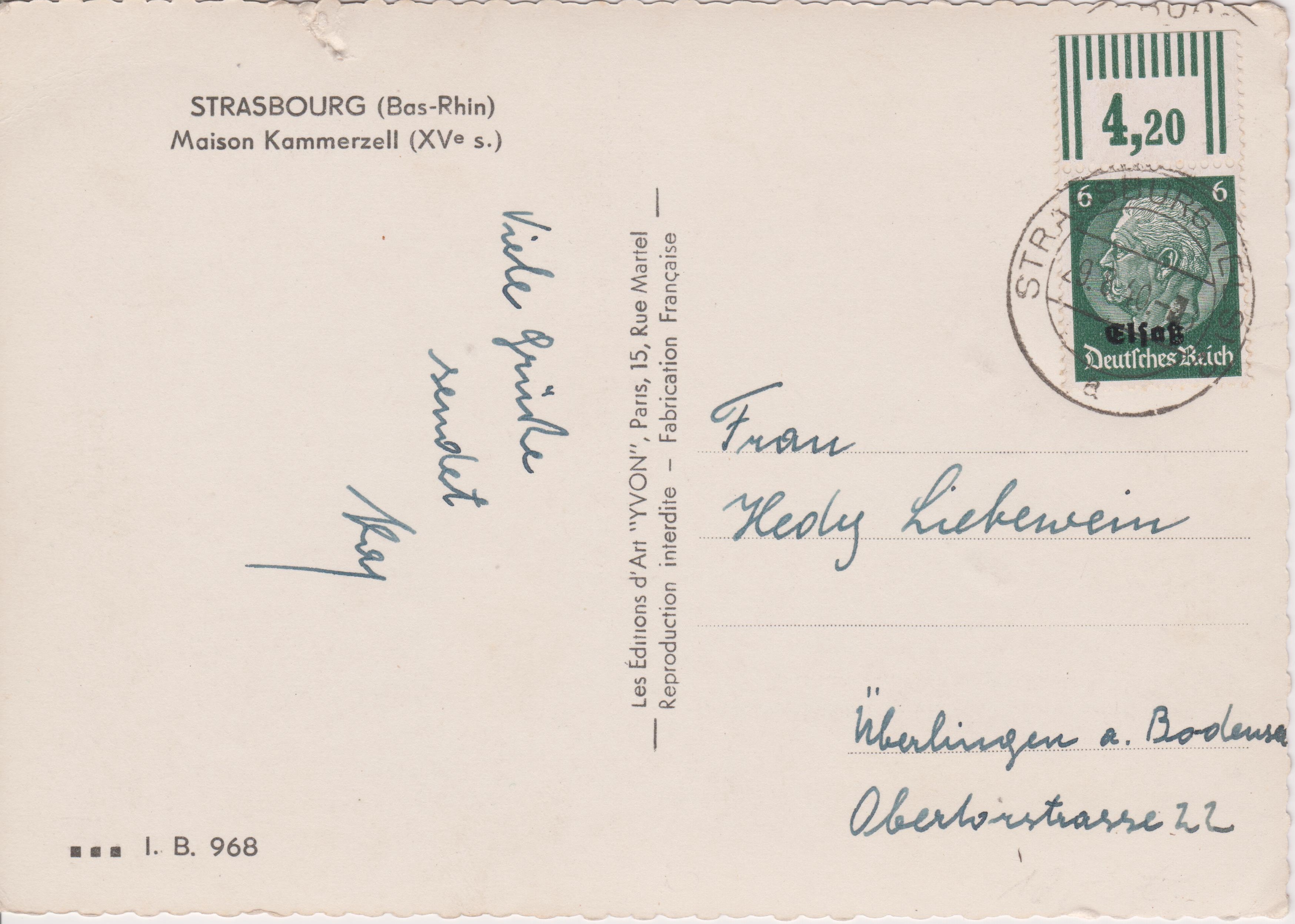 Postkarte mit Einzelfrankatur 6 Pf Dauerserie Hindenburg mit Aufdruck "Elsaß", oberer Bogenrand mit Wertangabe "4,20" (= Bogenfeld 7), aufgegeben am 29.08.1940 in STRASSBURG, adressiert nach "Überlingen":