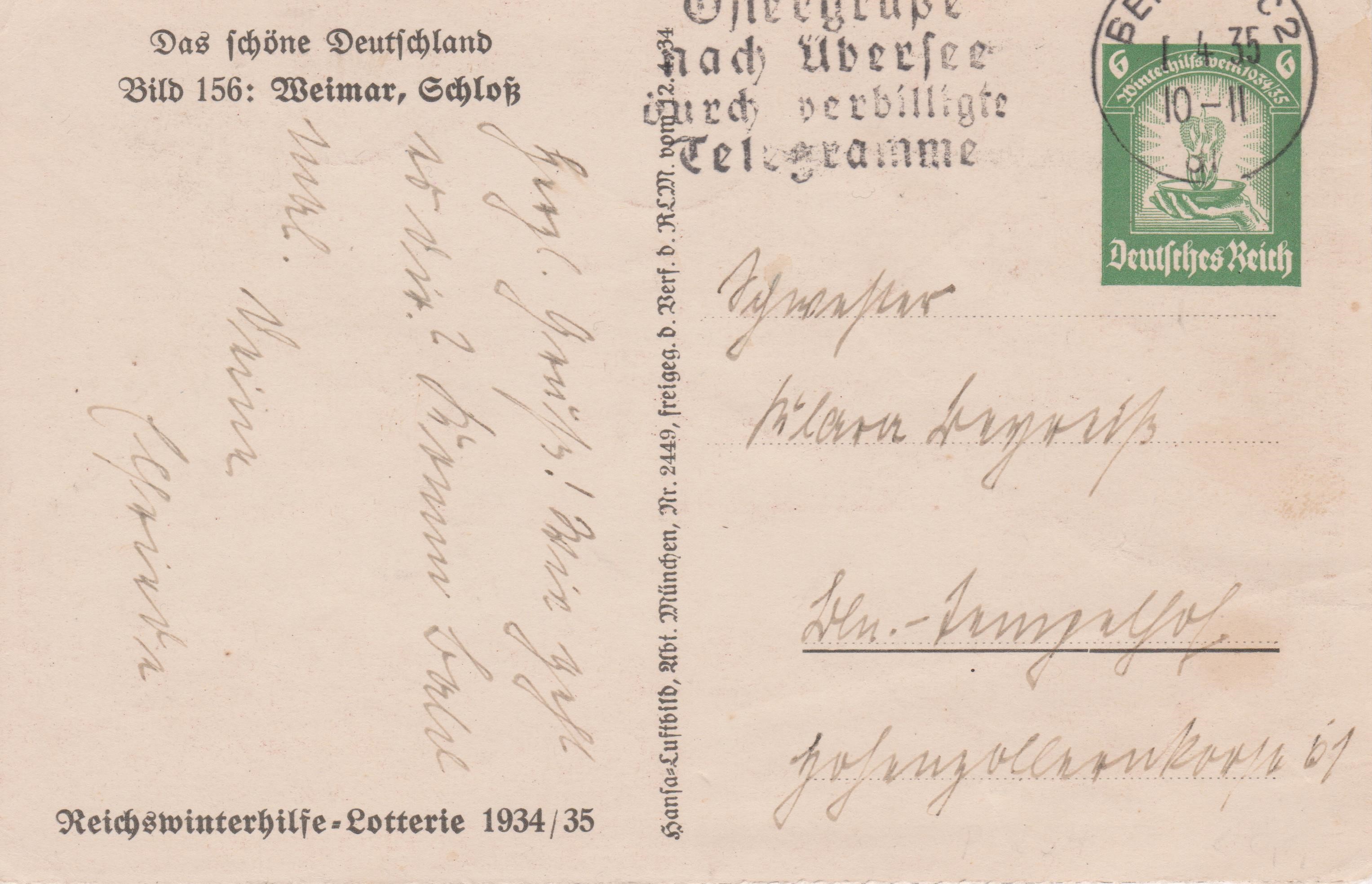 Ganzsache Deutsches Reich P 254 Bild 156 zeigt "Weimar, Schloß", hier gelaufen in Berlin: