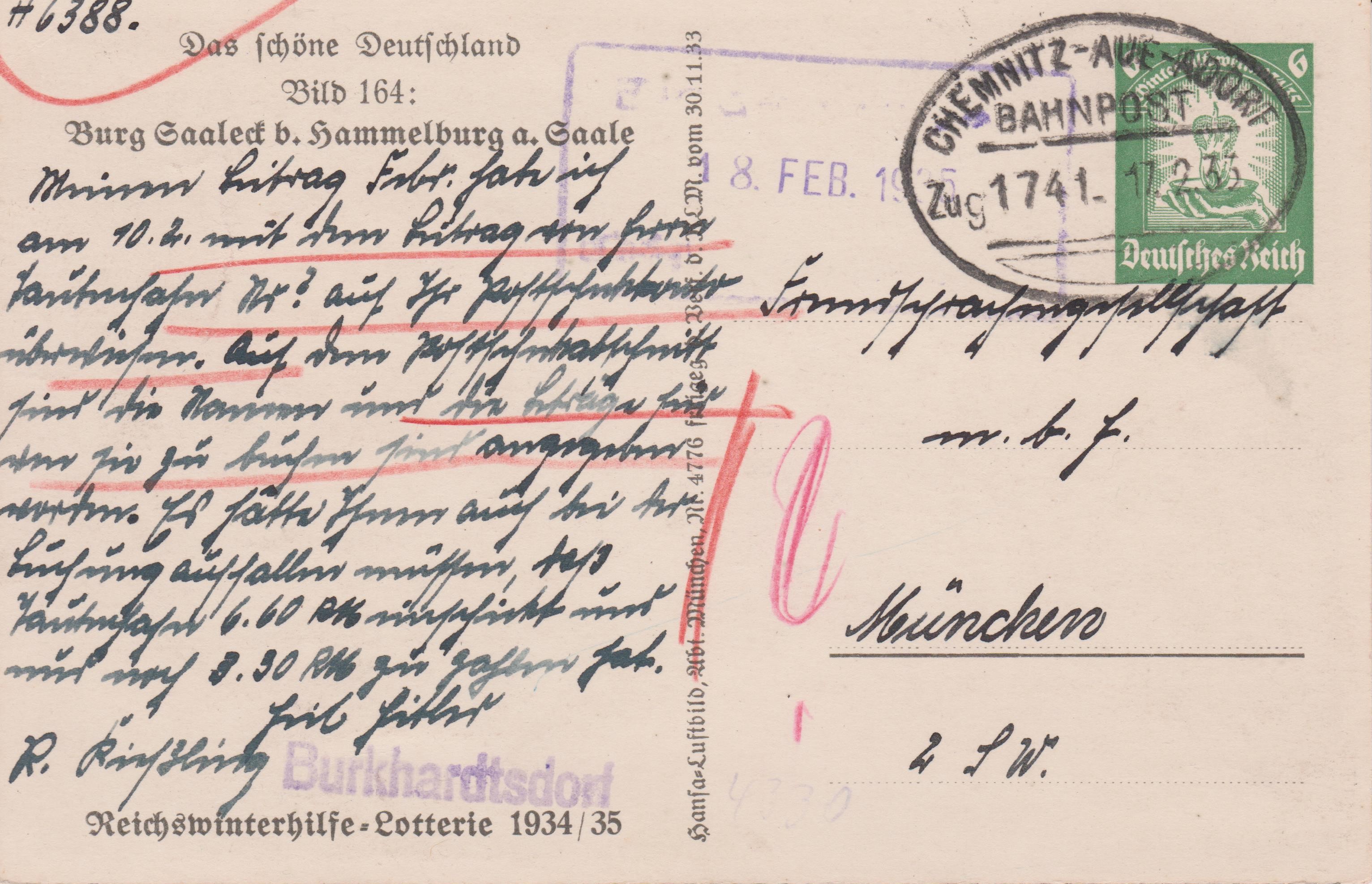 Ganzsache Deutsches Reich P 254 Bild 164 zeigt "Burg Saaleck b. Hammelburg a. Saale", hier am 17.02.1935 aufgegeben bei der "BAHNPOST Zug 1741 CHEMNITZ-AUE-ADORF" und im Fernverkehr gelaufen nach München: