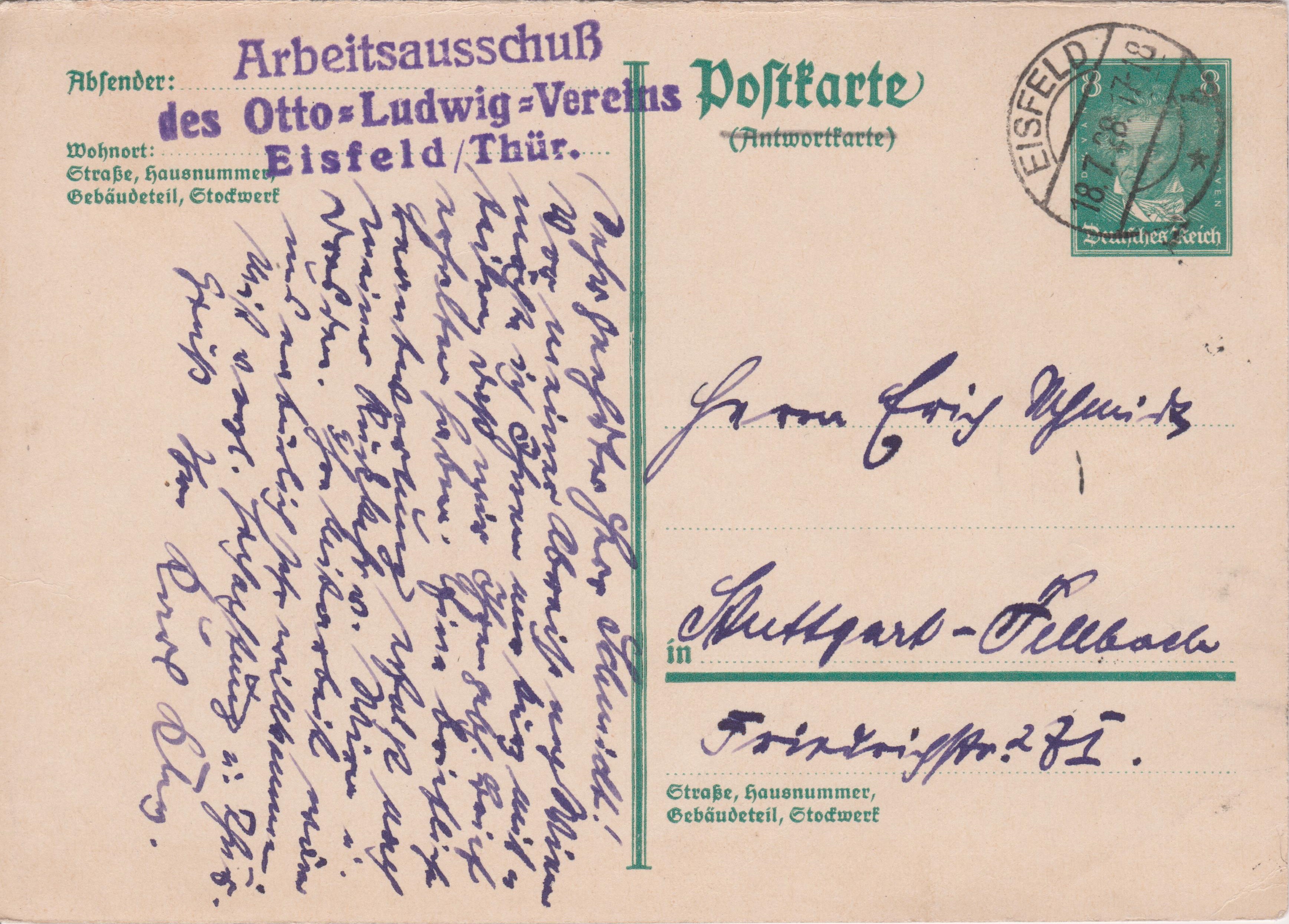 Antwortteil MiNr. 177 I A einer Postkarte MiNr. 177 I, am 18.07.1928 aufgegeben in "EISFELD", gelaufen nach Stuttgart: