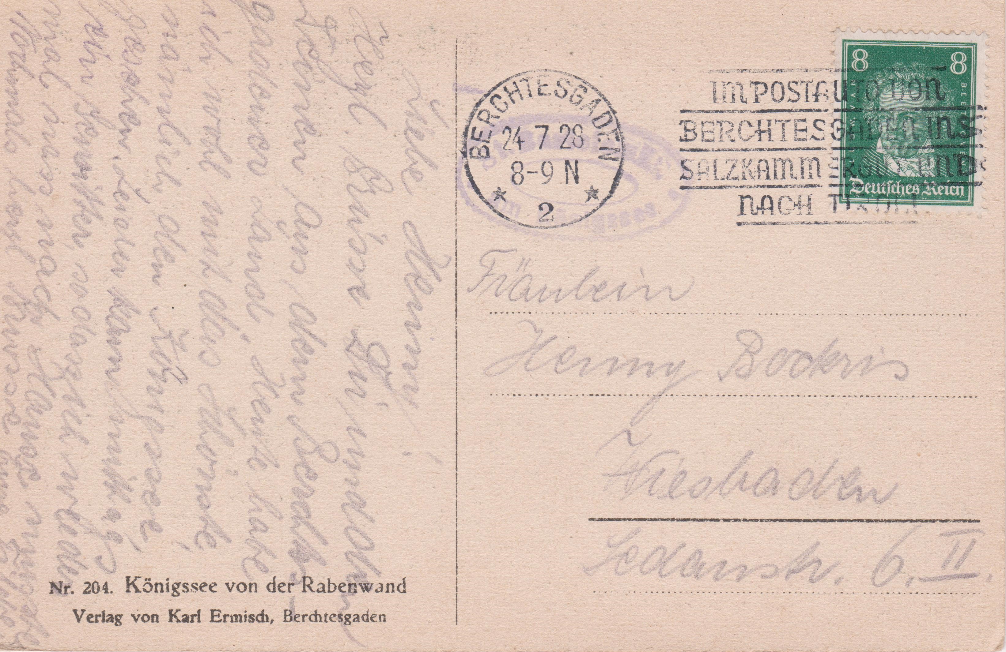 EF Deutsches Reich MiNr. 389 am 24.07.1928 portogerecht auf Postkarte im Fernverkehr, gelaufen von BERCHTESGADEN nach Wiesbaden: