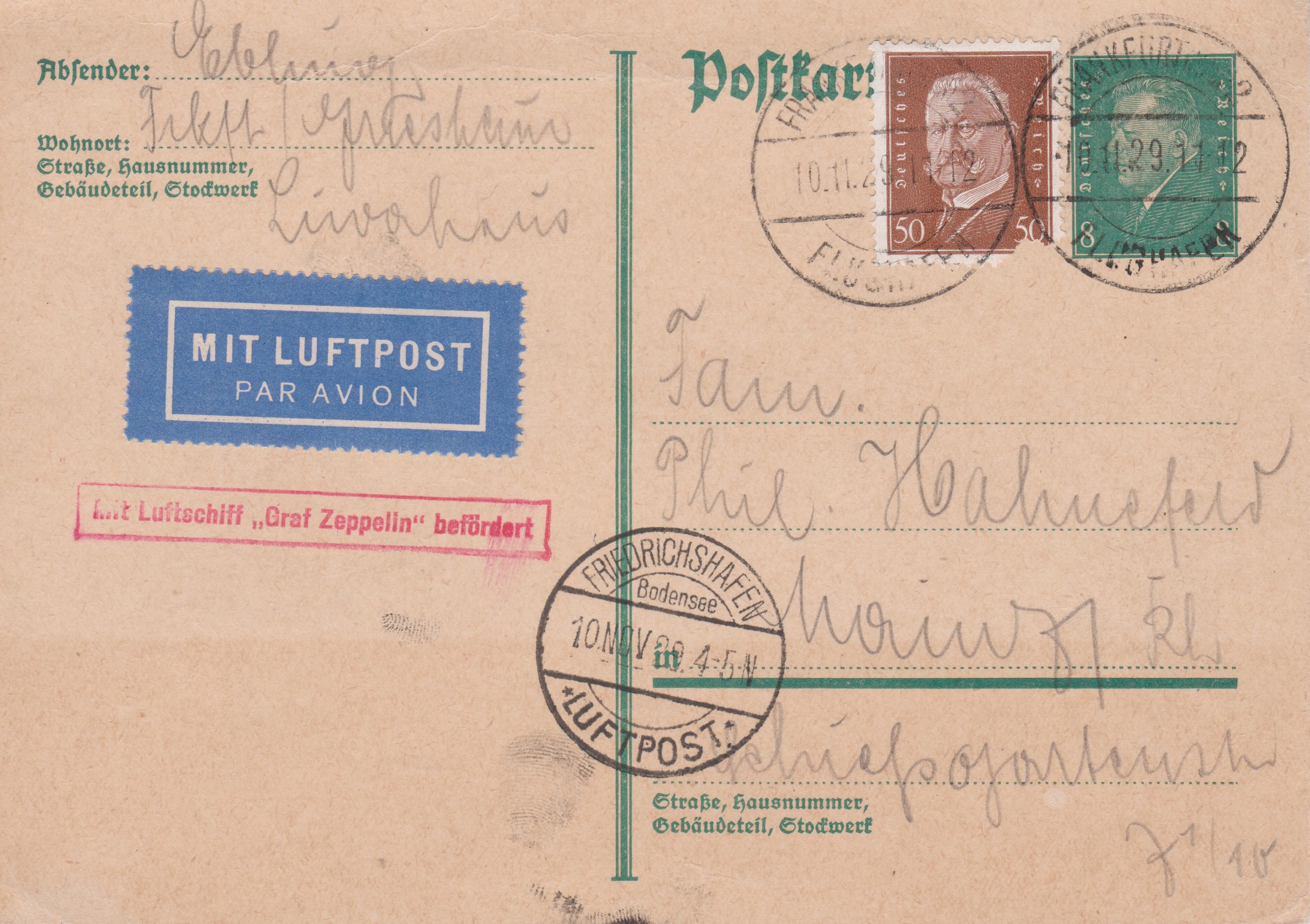 Ganzsache "Postkarte" 8 Pf Reichspräsidenten, MiNr. P 181 I, am 10.11.1929 mit 50 Pf Zusatzfrankatur aufgeliefert in FRANKFURT/MAIN und "Mit Luftschiff "Graf Zeppelin" befördert":