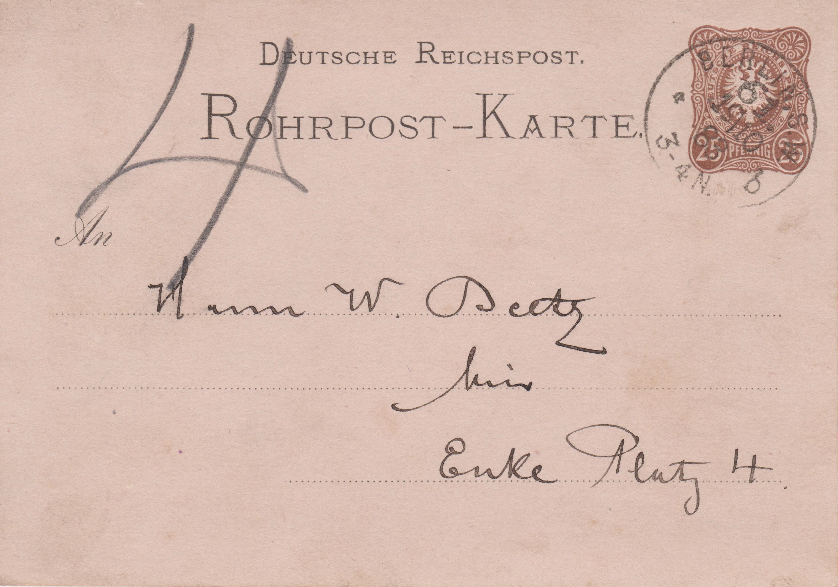 Ganzsache "Rohrpost-Karte", MiNr. RP 8, adressiert nach "hier. W.", am 25XII96 (= Erster Weihnachtsfeiertag!) aufgegeben und per Tagesstempel der Rohrpost um 9 Uhr 20 entwertet in "BERLIN, W. P 64 (R 7)":