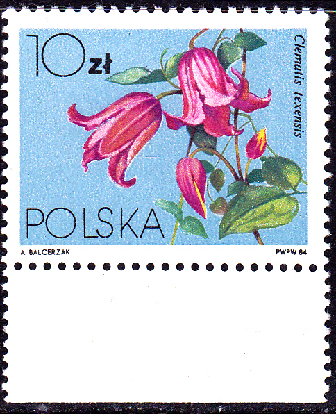 In einer Serie "Kletterpflanzen" ist in Polen diese Marke (MiNr 2906) erschienen. Sie zeigt eine Blüte der Wolligen Waldrebe (Clematis lanuginosa).