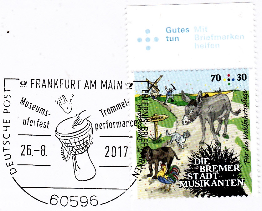 Der Sonderstempel aus Frankfurt vom 26.8.2017 zu einer Trommelperformance beim Museumsuferfest zeigt eine afrikanische Trommel mit trommelnden Händen.