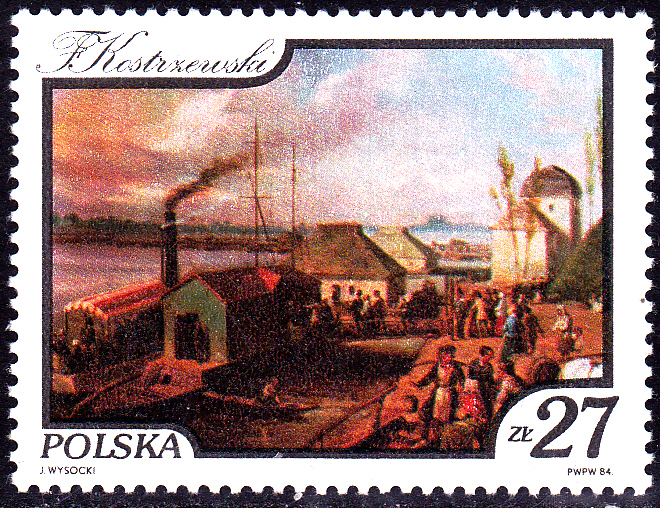 Aus Polen kommt diese Marke (MiNr 2924) mit dem Gemälde "Anlegestelle für Dampfschiffe im Weichselgebiet" von Franciszek Kostrzewski.