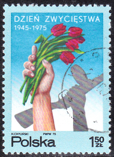 Zum 30. Jahrestag der Beendigung des Zweiten Weltkrieges ist in Polen ebenfalls eine Marke (MiNr 2376) erschienen. Sie zeigt Erhobene Hände mit Tulpen und Gewehr.
