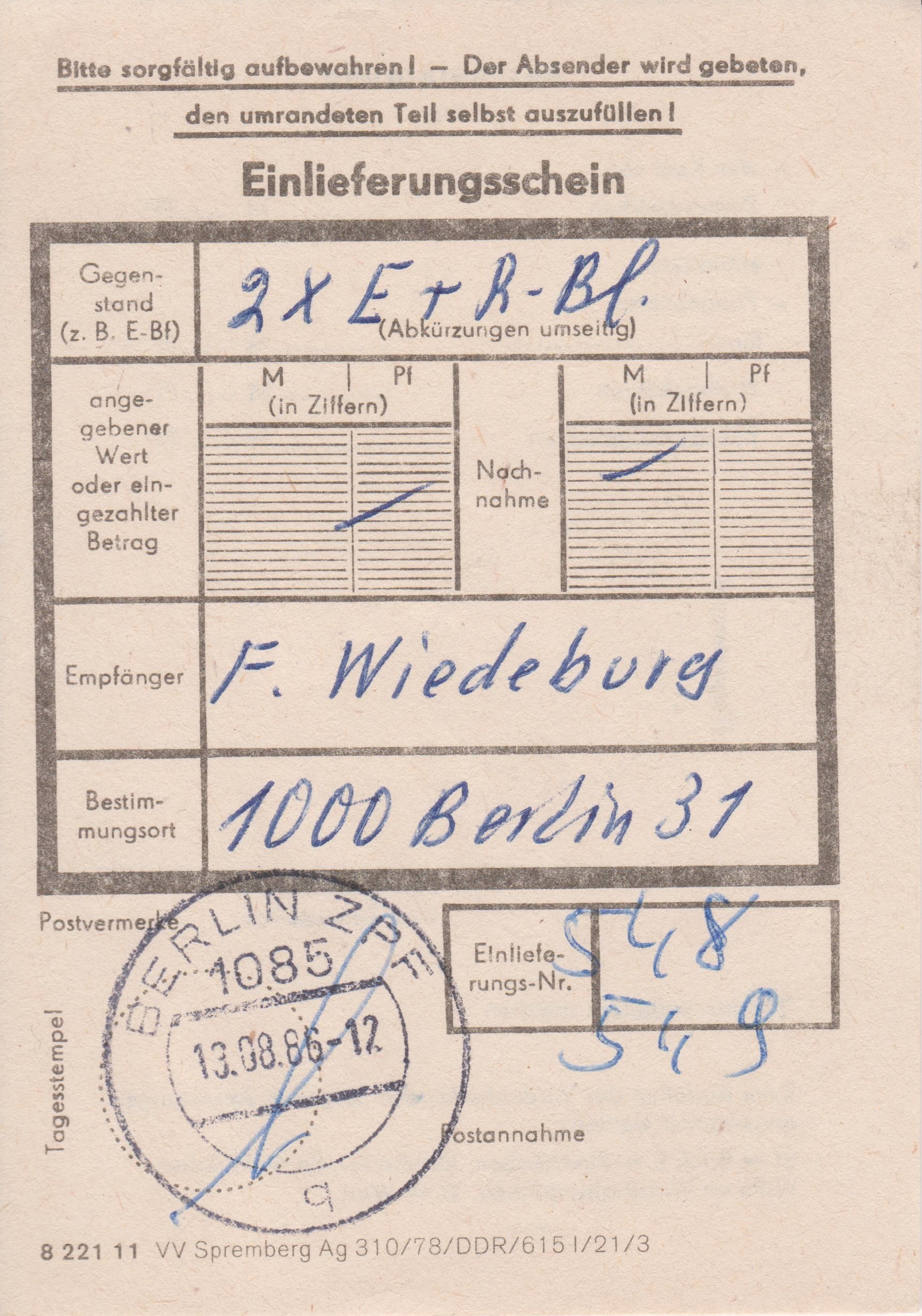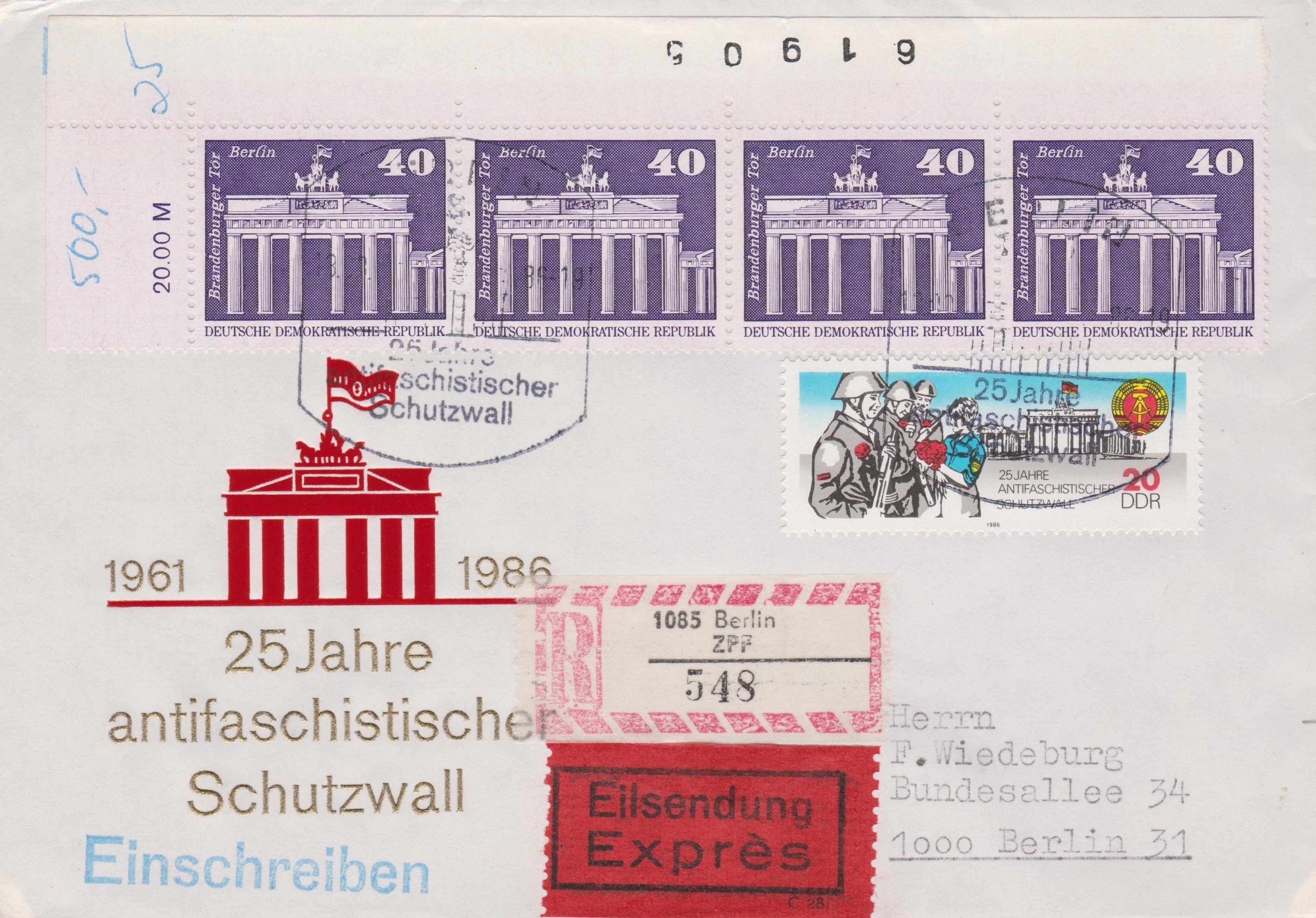 Dieser mit 1,80 M frankierte Brief lief am 13.08.1986 als "Eilsendung" per Einschreiben von 1085 BERLIN ZPF nach 1000 Berlin 31: