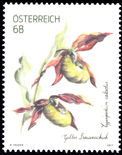 Diese Marke aus Österreich (MiNr 3328) bildet Blüten des Gelben Frauenschuh (Cypripedium calceolus) ab.