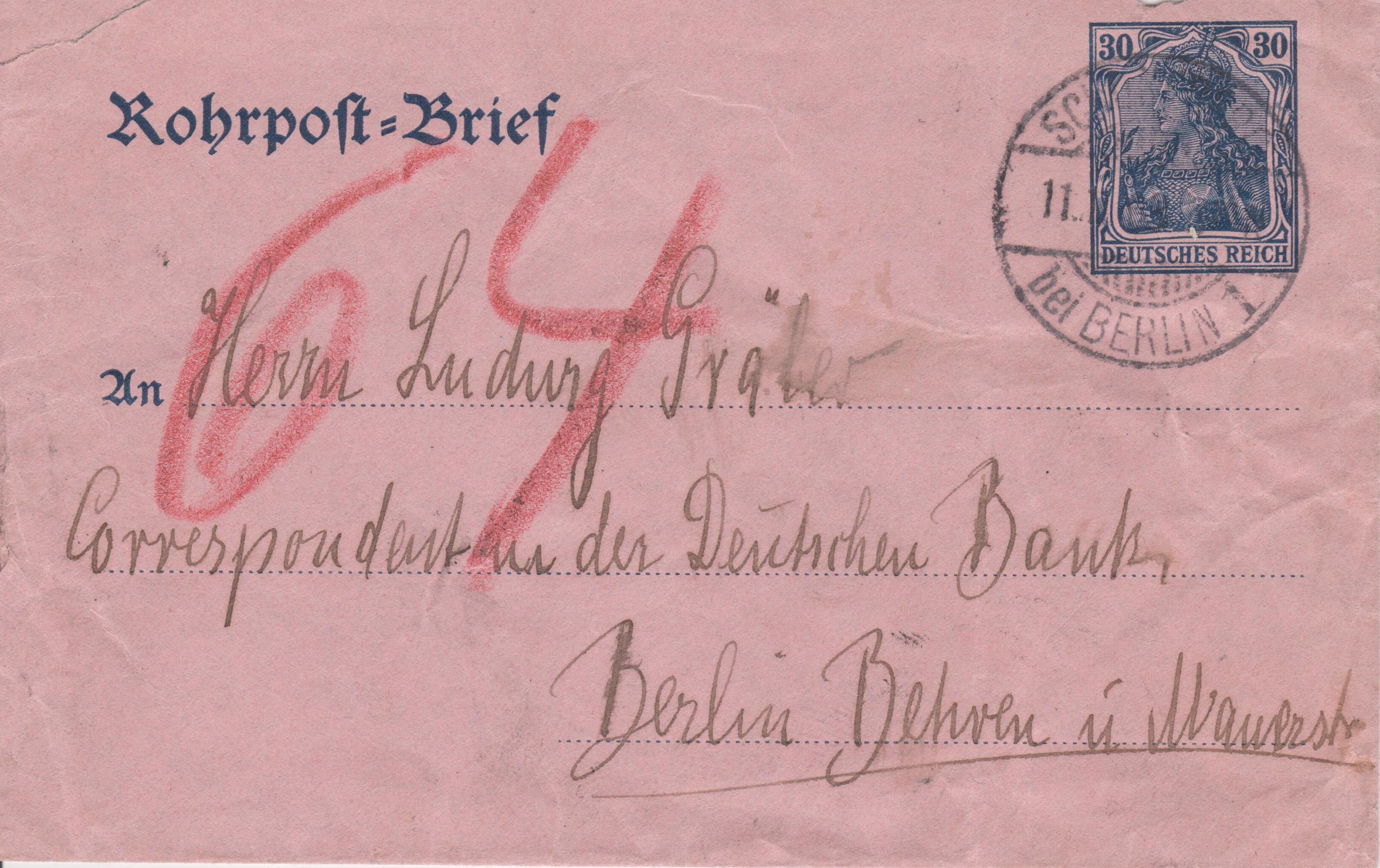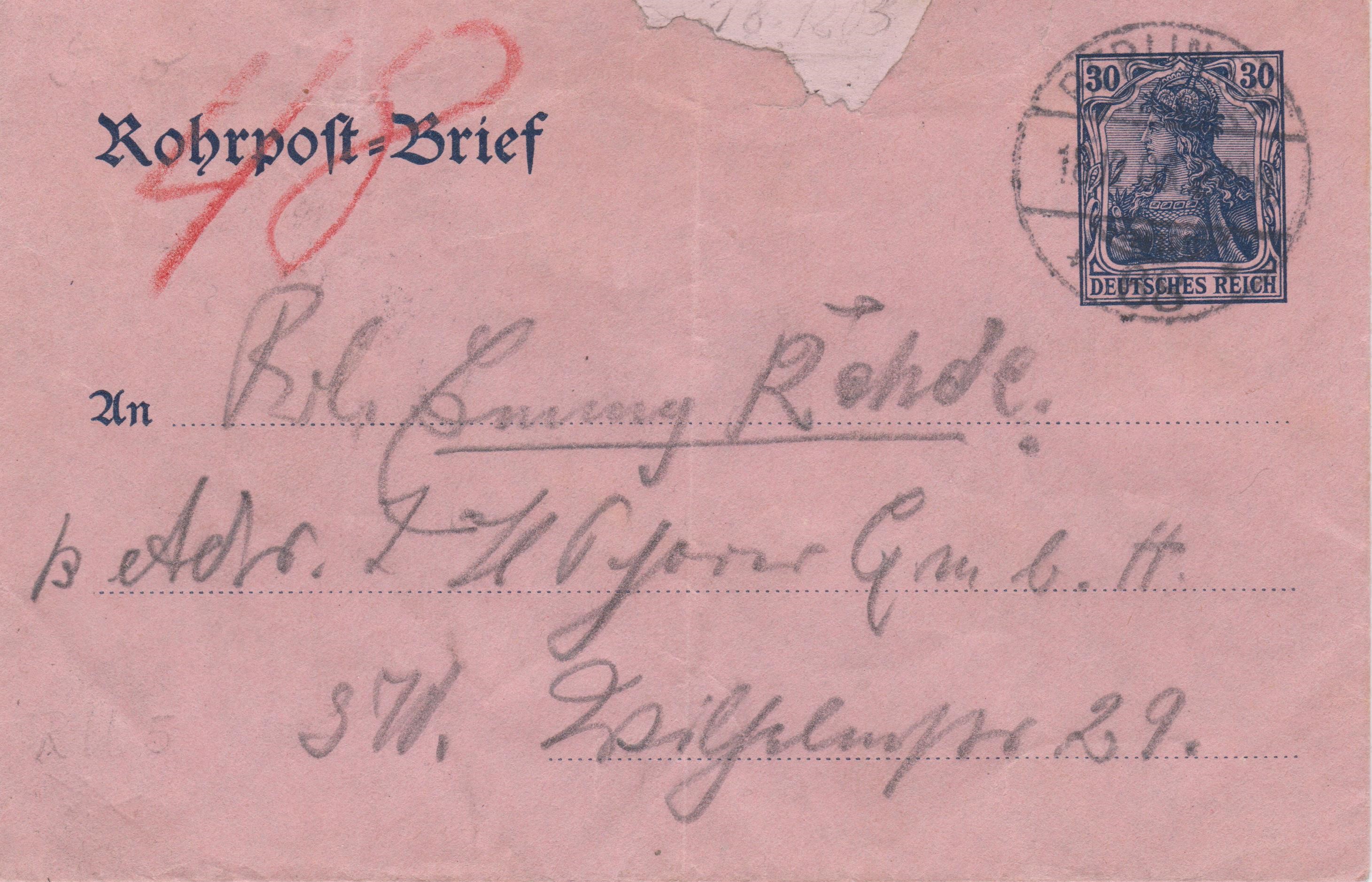 Rückseitig Ankunftstempel der Berliner Rohrpost "BERLIN,W. P 9 (R 6)":