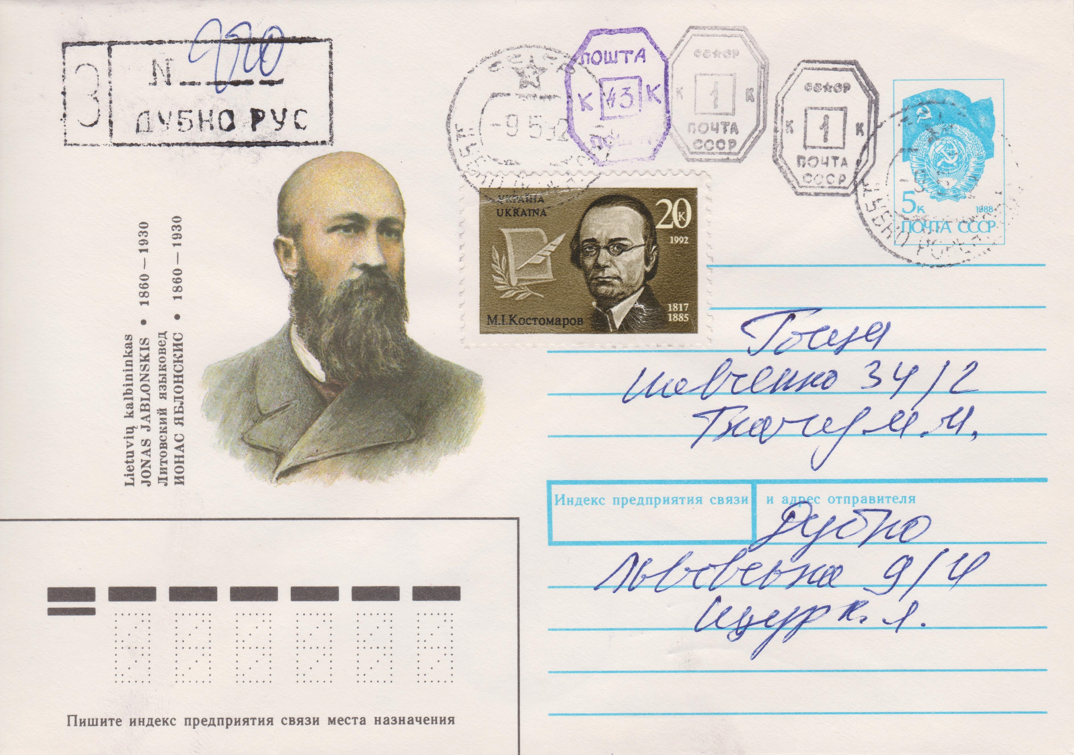 Diese Ganzsache in Briefform mit eingedrucktem Postwertzeichen erschien ebenfalls 1992 zum 150. Geburtstag von Mykola Lyssenko