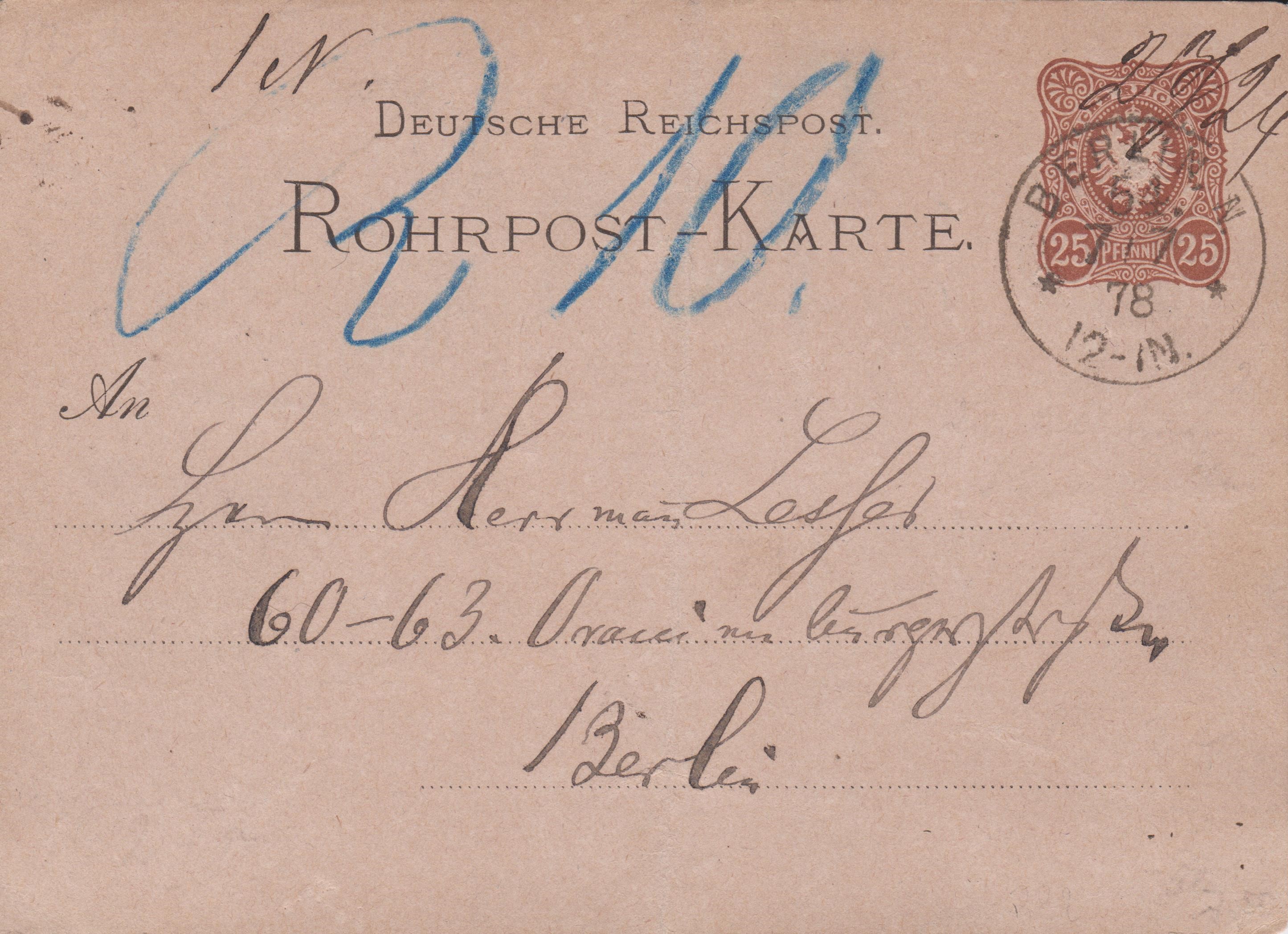 Die "Berlin Oranienburgerstraße" adressierte Sendung wurde per Rohrpost in "R 10" (= Rohr 10) befördert.