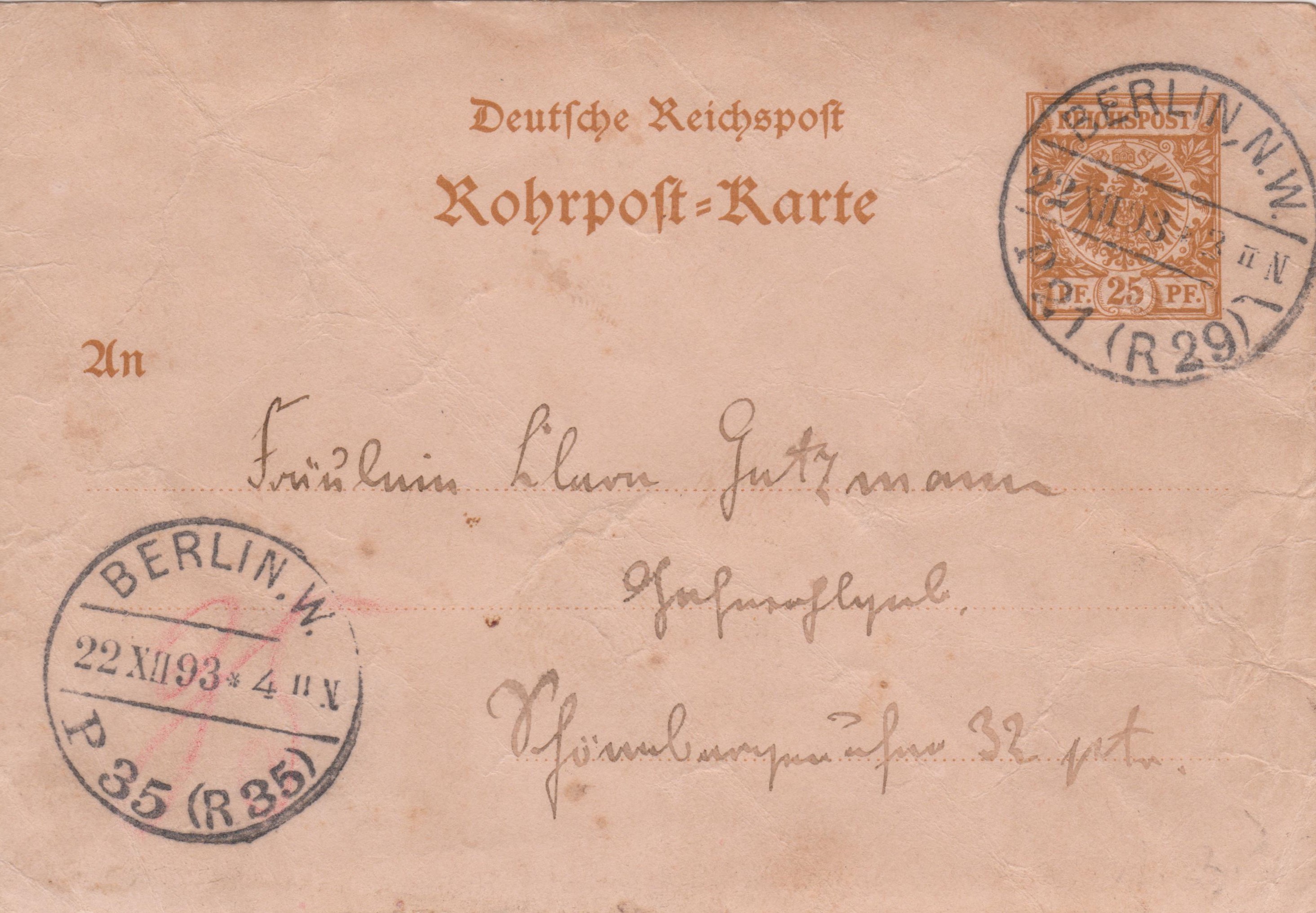 Die "Berlin Oranienburgerstraße" adressierte Sendung wurde per Rohrpost in "R 10" (= Rohr 10) befördert.