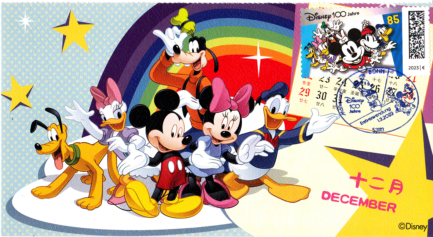 Bei der Deutschen Post ist zum Jubiläum "100 Jahre Walt Disney Studios" diese Marke (MiNr 3754) mit bekannten Zeichentrickfiguren aus dem Studio von Walter Elias Disney erschienen. Gezeigt wird dabei auch Mickey Mouse.