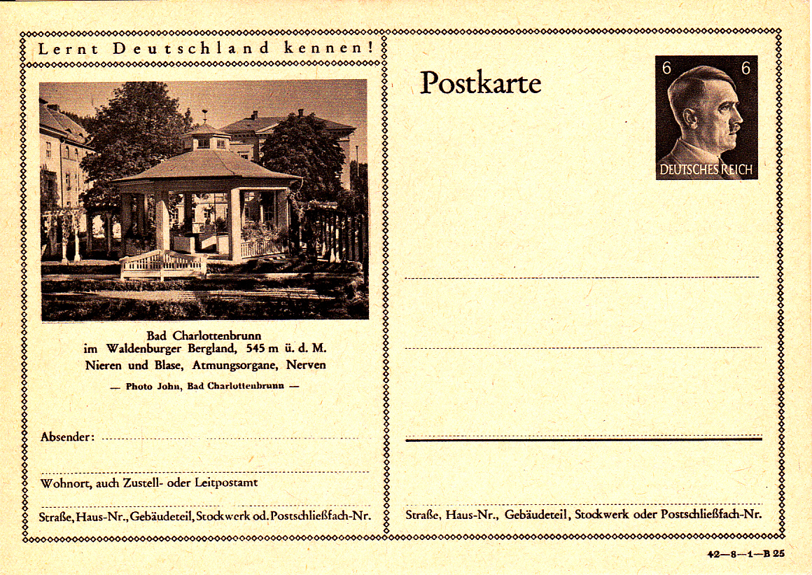 Bad Charlottenbrunn ist mit einem zweiten Motiv auf dieser Karte (Serie 8 Bild 25) im Jahrgang 1942 vertreten.