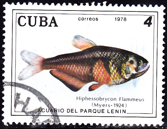 Eine Marke aus Kuba (MiNr 2304) zeigt einen Roten von Rio (Hyphessobrycon flammeus)