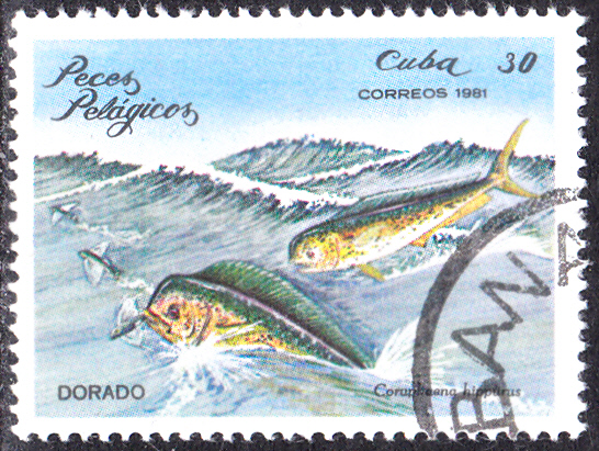 Aus Kuba kommt diese Marke (MiNr 2538) mit zwei Gemeinen Goldmakrelen (Coryphaena hippurus).