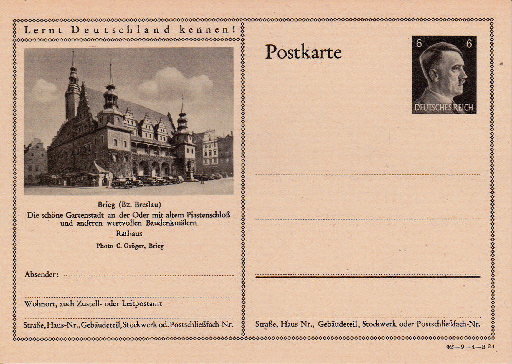 Brieg (Bz Breslau) zeigt auf dieser Karte (Serie 9 Bild 19) erneut das Rathaus. Brieg heißt heute Brzeg und ist eine Kreisstadt im Powiat Brzeski der polnischen Woiwodschaft Opole.
