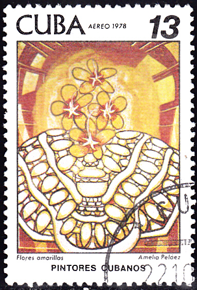 Diese Marke (MiNr 2338) der gleichen Serie zeigt ein "Stillleben mit Blumen" von Amelia Peláez del Casal.